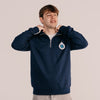 Ga voor stijl én comfort met deze navy quarter-zip pullover van Club Brugge. Met het clublogo op de borst, een hoge kraag en zachte ribboorden is dit de ideale trui voor frisse dagen. Perfect voor in het stadion, onderweg of gewoon thuis op de bank.